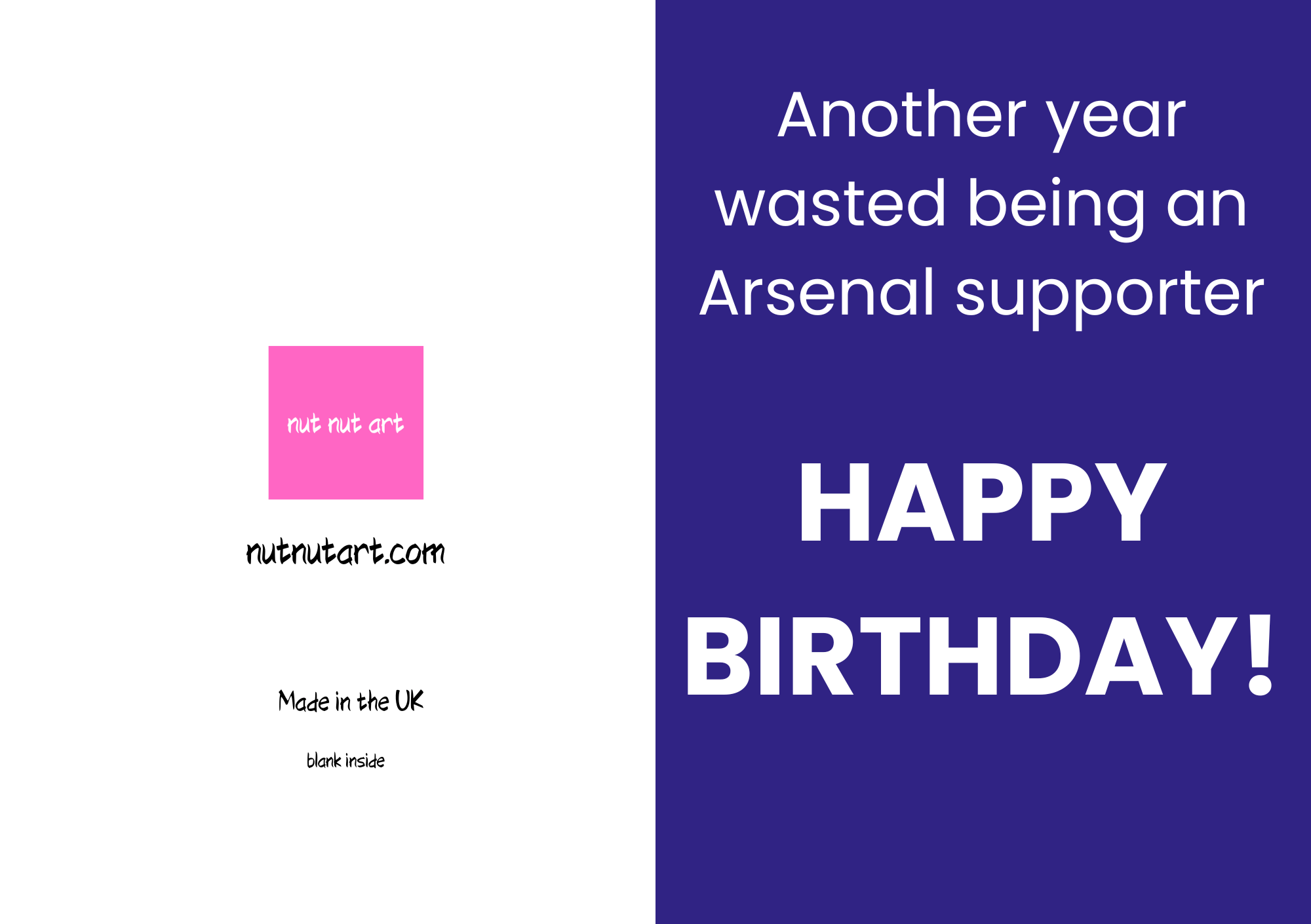 Humorous birthday card for an Arsenal fan. Blank inside. White envelope. 5x7in.